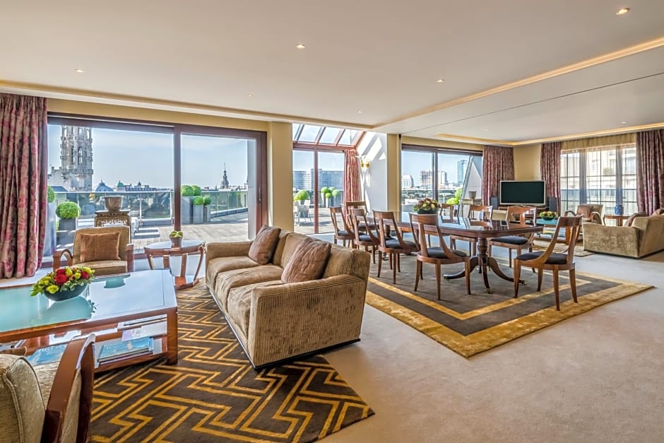 This suite features a hallway with an elegant work desk, as well as a living room with a dining table, a private bar and a dressing room. The large private bathroom is fitted with a hot tub and a sauna.